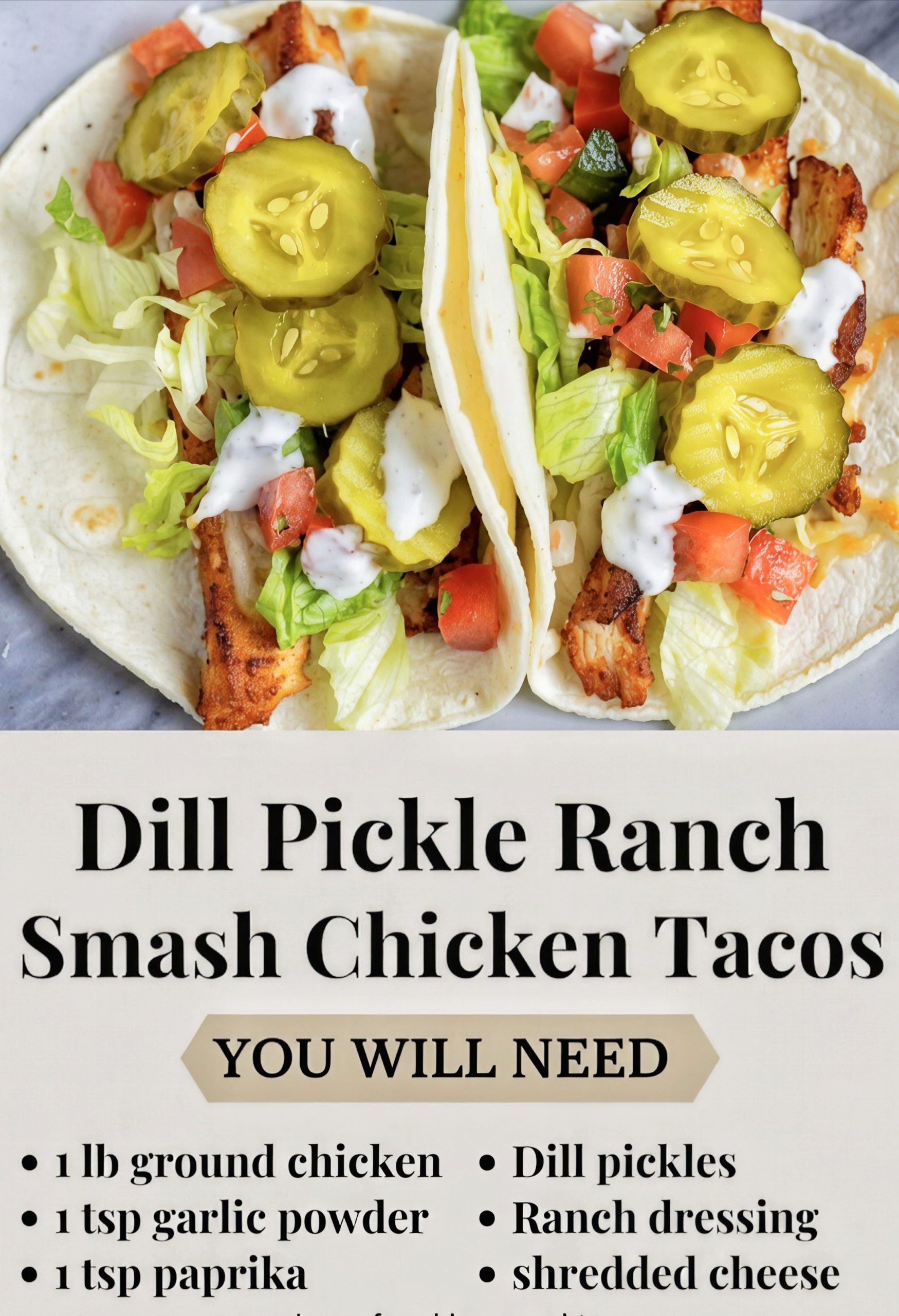 - Assemble the Tacos: Drizzle ranch over chicken, add sliced pickles, sprinkle fresh dill, and top with crispy cheese lace. Add optional toppings as desired.