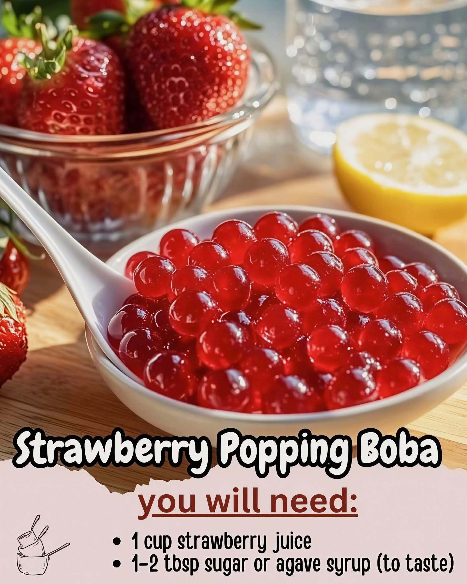Strawberry popping boba is a fun, fruity treat that bursts with flavor in every bite. Perfect for topping drinks, desserts, or enjoying straight from the cup, these little spheres are sure to delight kids and adults alike!
